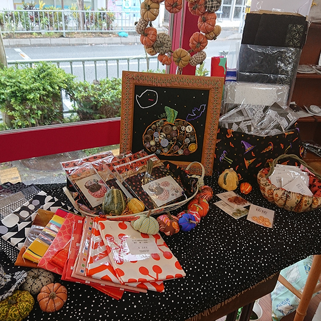 気分だけでもハロウィン気分をと、使う布をオレンジと黒で店内を少しだけ飾りました♪