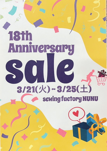 ただ今 Sewing factory NUNU では 15周年記念セール 開催中!!