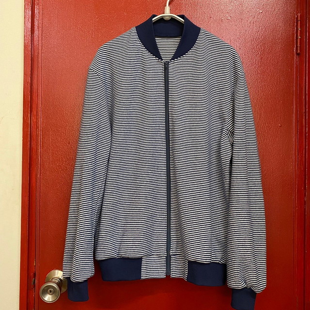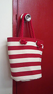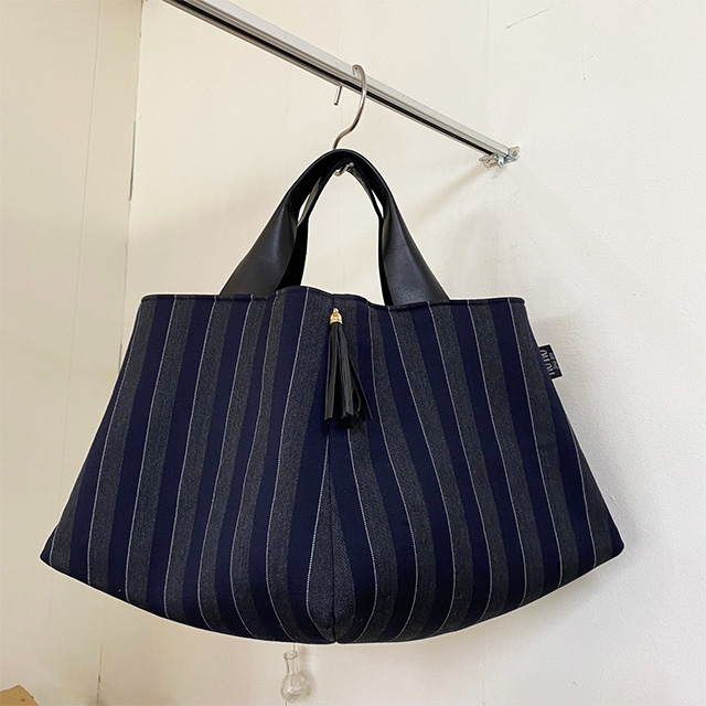 ボーダー柄の帆布、持ち手のロープは、ブルー系もあります。 [写真中]