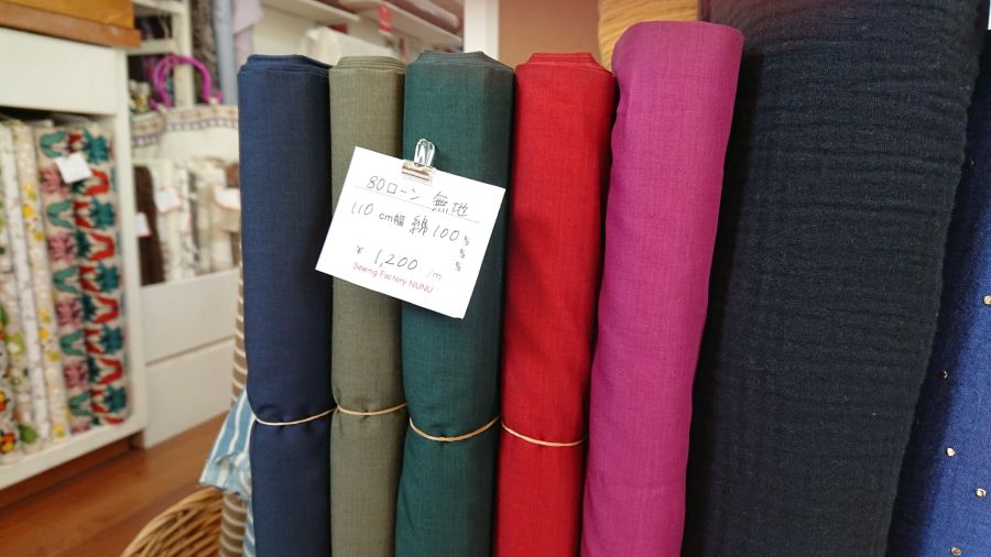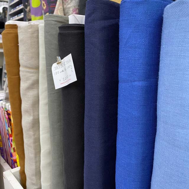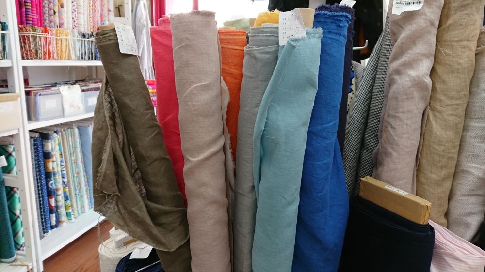 今年の夏もたくさん入荷しています。一押しは12色のリネン無地。(110cm幅 ¥2,600/m(税込))